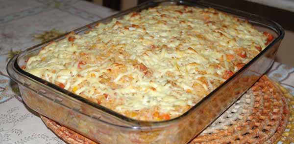 Em seguida, em um refratário, coloque metade desse arroz, cubra com o recheio de carne moída refogada e finalize com o restante do arroz.