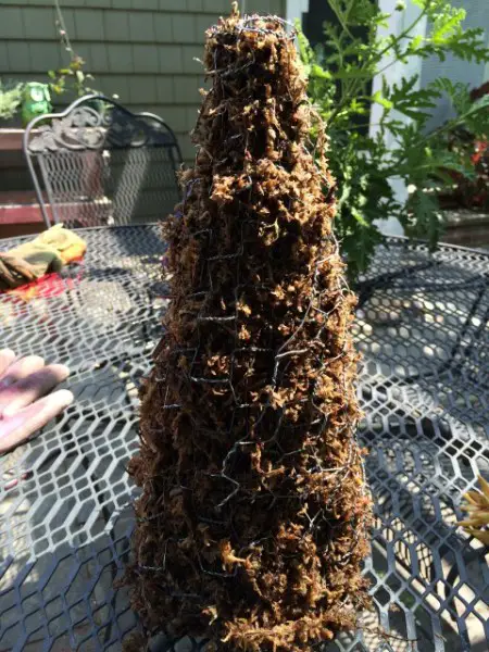 Sature o musgo esfagno com água e recheie a forma com o musgo firmemente; Certifique-se de embalar o musgo de modo que você tenha uma base firme para trabalhar