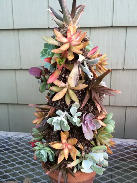 Minha árvore suculenta continuou crescendo durante todo o verão e, periodicamente, eu cortava uma ponta que estava ficando muito longa e preenchia um local vazio para que, no final da estação de crescimento, minha árvore estivesse completamente preenchida.
