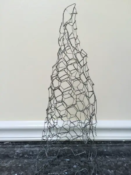 Corte um pedaço de tela de galinheiro com cerca de 45 centímetros de comprimento. Esse comprimento depende do tamanho da árvore com a qual você deseja terminar. O meu terminou com 15 centímetros de altura e 25 centímetros de largura na base.