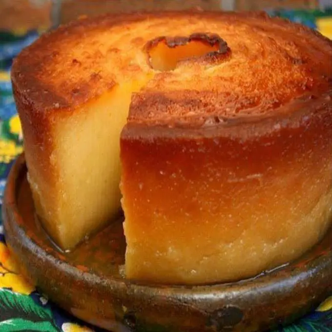 Faça uma calda rala com o açúcar e água suficiente para ficar em ponto de fio. Coloque a manteiga na calda ainda quente para derreter. Reserve. Bata bem as gemas com a massa de mandioca (pode-se comprar pronta em alguns mercados do Nordeste) e acrescente lentamente o leite de coco diluído em meia xícara de água.