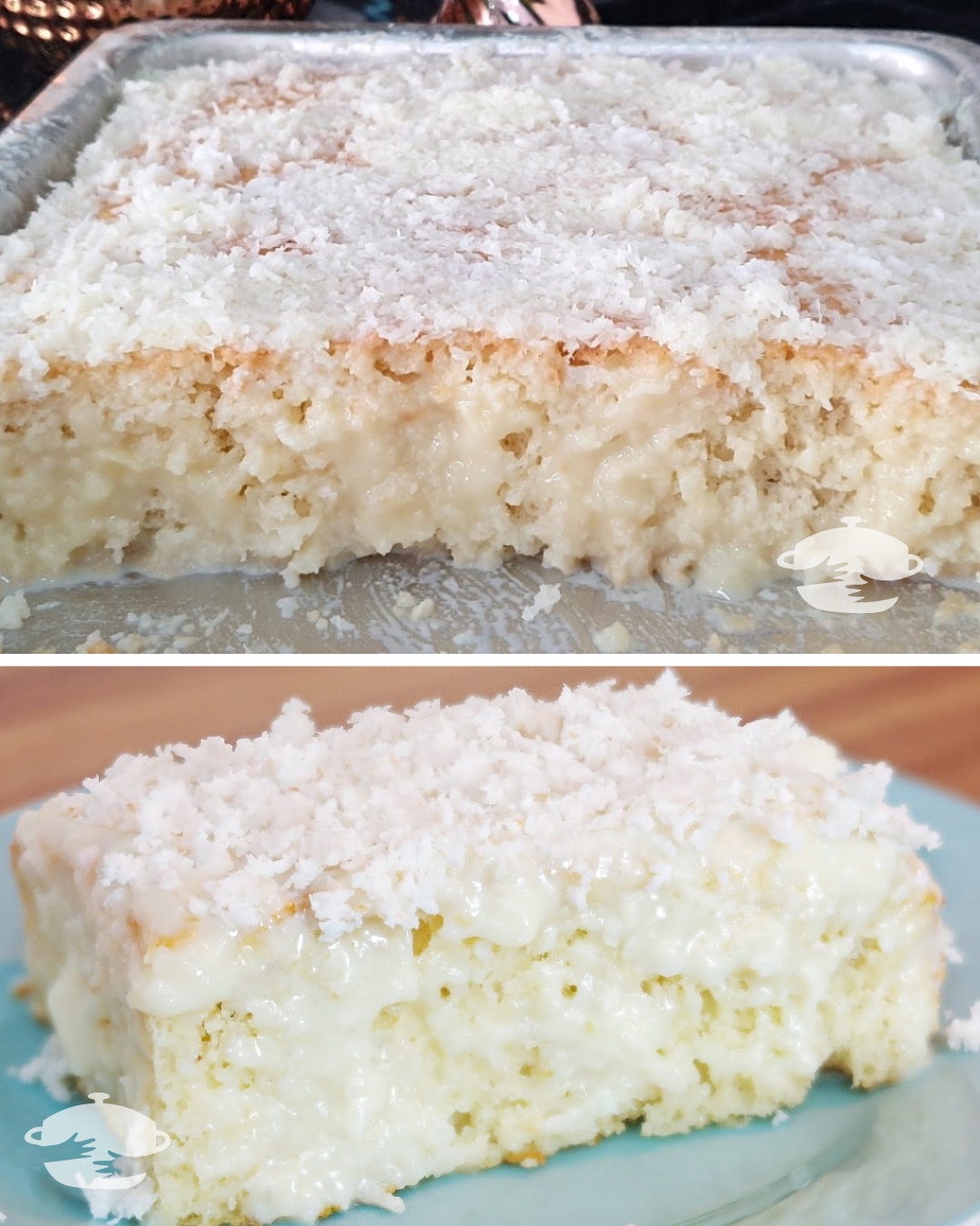 Montagem do Bolo: Assim que o bolo estiver assado e ainda quente, faça furos em toda a sua superfície com um garfo ou palito de churrasco. Despeje a cobertura de leite condensado e leite de coco sobre o bolo, garantindo que ele fique bem molhadinho.