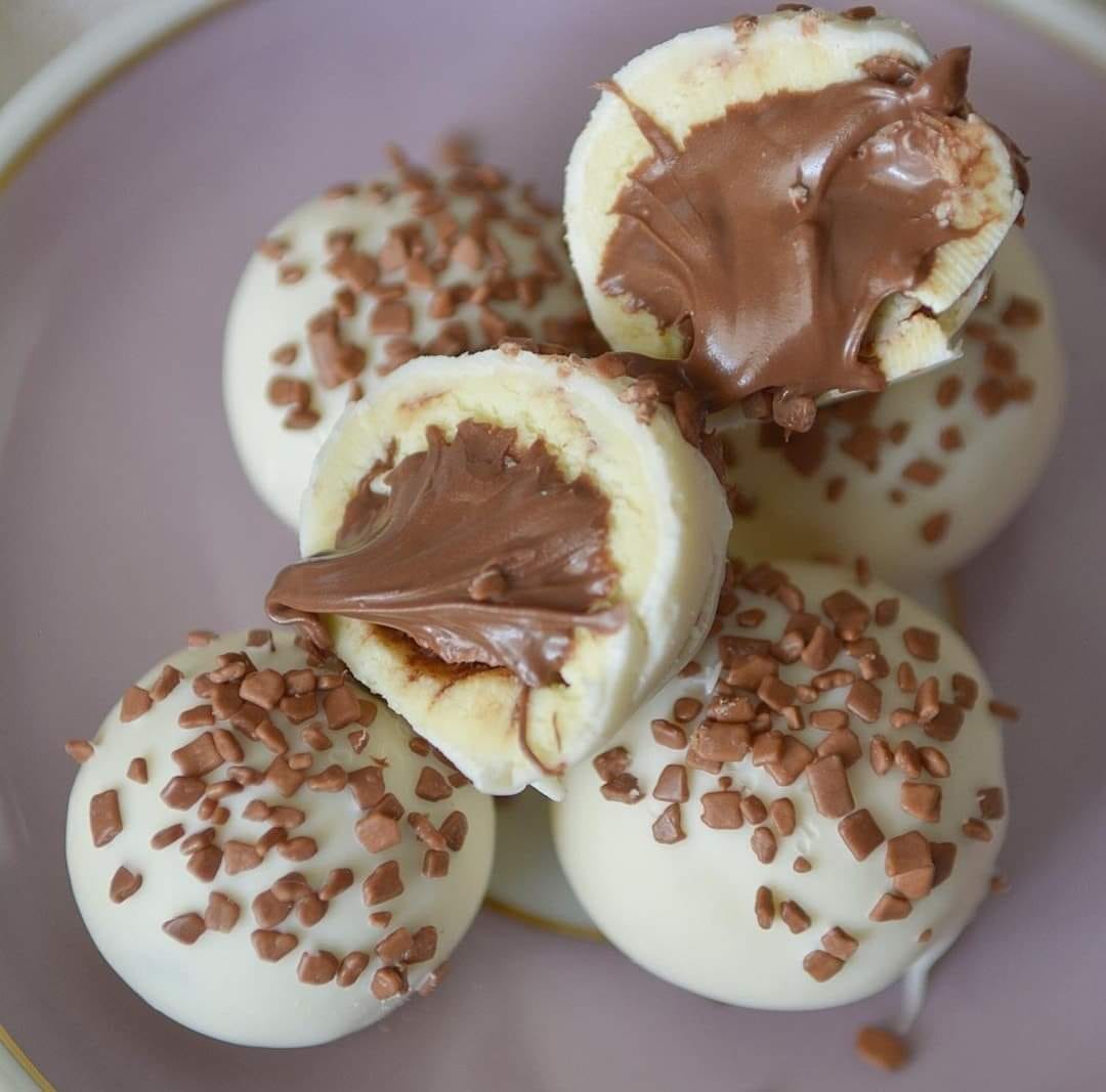 2 – Separe uma porção da massa, recheie com nutella, modele bolinhas, banhe no chocolate derretido e disponha sobre uma assadeira forrada com papel manteiga. Salpique confeito de chocolate, sirva quando estiver firme