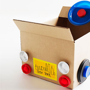Use um marcador para desenhar uma placa em papel colorido e prenda-a entre as luzes traseiras usando fita amarela. Cole a tampa do frasco de plástico vermelho restante no centro de um prato azul e cole no painel para fazer o volante. Empurre a chave no papelão à direita do volante. Cole a tampa de um frasco de plástico azul no centro da tampa de uma lata de café de plástico preto; repita para fazer quatro rodas e cole cada uma delas no lugar. Cole uma tampa de ketchup na parte traseira esquerda do carro para fazer um tanque de gasolina.
