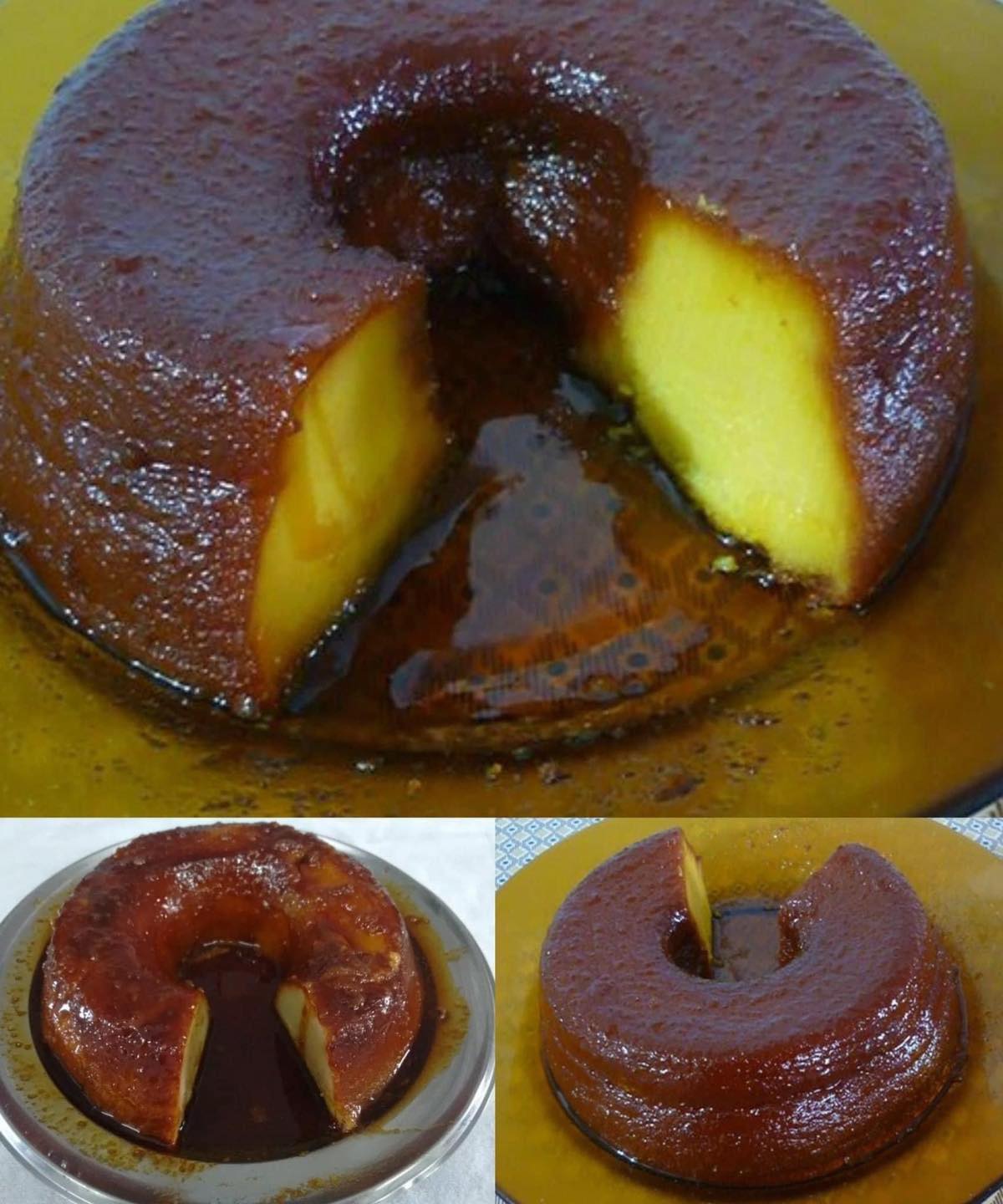Depois espalhe por toda a forma, deixe esfriar o caramelo, coloque para ferver em banho-maria por 50 minutos. Desenforme ainda morno, bom apetite.