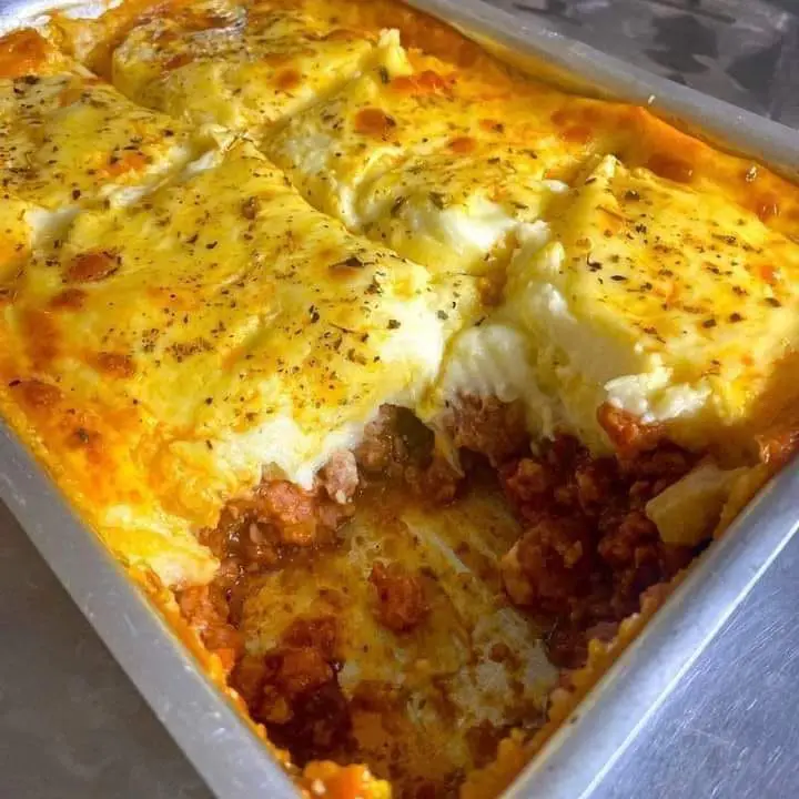 Em refratário, distribua metade da batata e espalhe o recheio de linguiça. Cubra com o restante da batata e coloque o queijo e leve ao forno até gratinar.