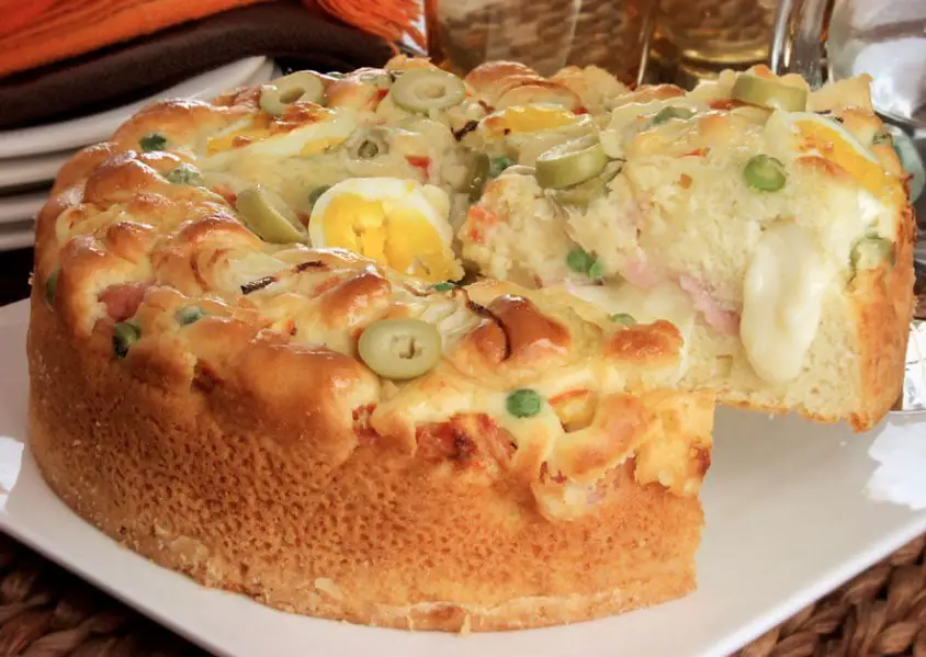 A torta portuguesa é deliciosa e lembra bastante o sabor da pizza, sendo seu ponto forte o recheio feito com a mistura de presunto, ovos, queijo, cebola, milho, ervilha e muitos temperos além, disso você pode estar acrescentando bacon que traz muito mais sabor ao quitute.